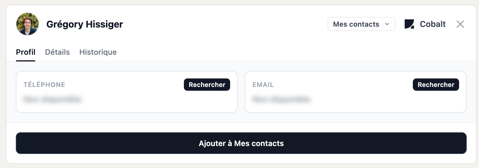 Cobalt peut actualiser périodiquement les données des profils en vérifiant les sources publiques (LinkedIn public, etc.). Vous êtes alerté quand un candidat change de poste ou met à jour son profil.