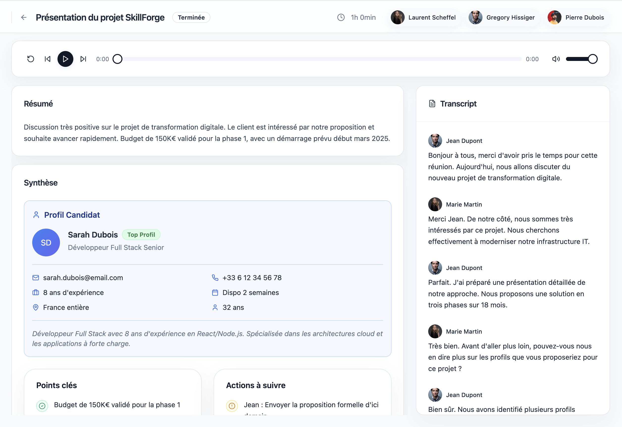 L'IA identifie et structure automatiquement : les compétences mentionnées, la disponibilité, les prétentions salariales, la mobilité, les motivations, et génère un résumé exécutif de l'échange.